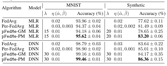 python3 main.py --dataset Mnist --model dnn --batch_size 20 --learning_rate 0.005 --personal_learning_rate 0.09 --beta 1 --lamda 15 --num_global_iters 800 --local_epochs 20 --algorithm pFedMe --numusers 5 --times 10 python3 main.py --dataset Mnist --model dnn --batch_size 20 --learning_rate 0.005 --num_global_iters 800 --local_epochs 20 --algorithm FedAvg --numusers 5 --times 10 python3 main.py --dataset Mnist --model dnn --batch_size 20 --learning_rate 0.005 --beta 0.001 --num_global_iters 800 --local_epochs 20 --algorithm PerAvg --numusers 5 --times 10