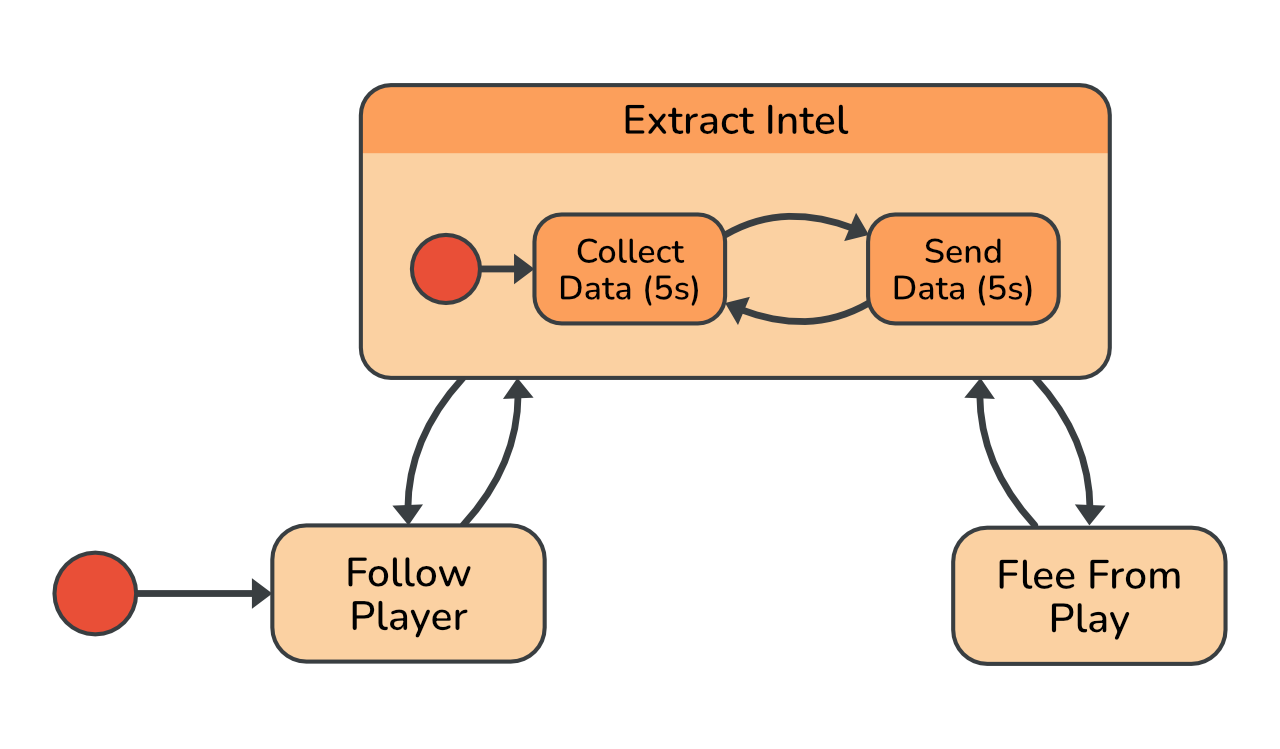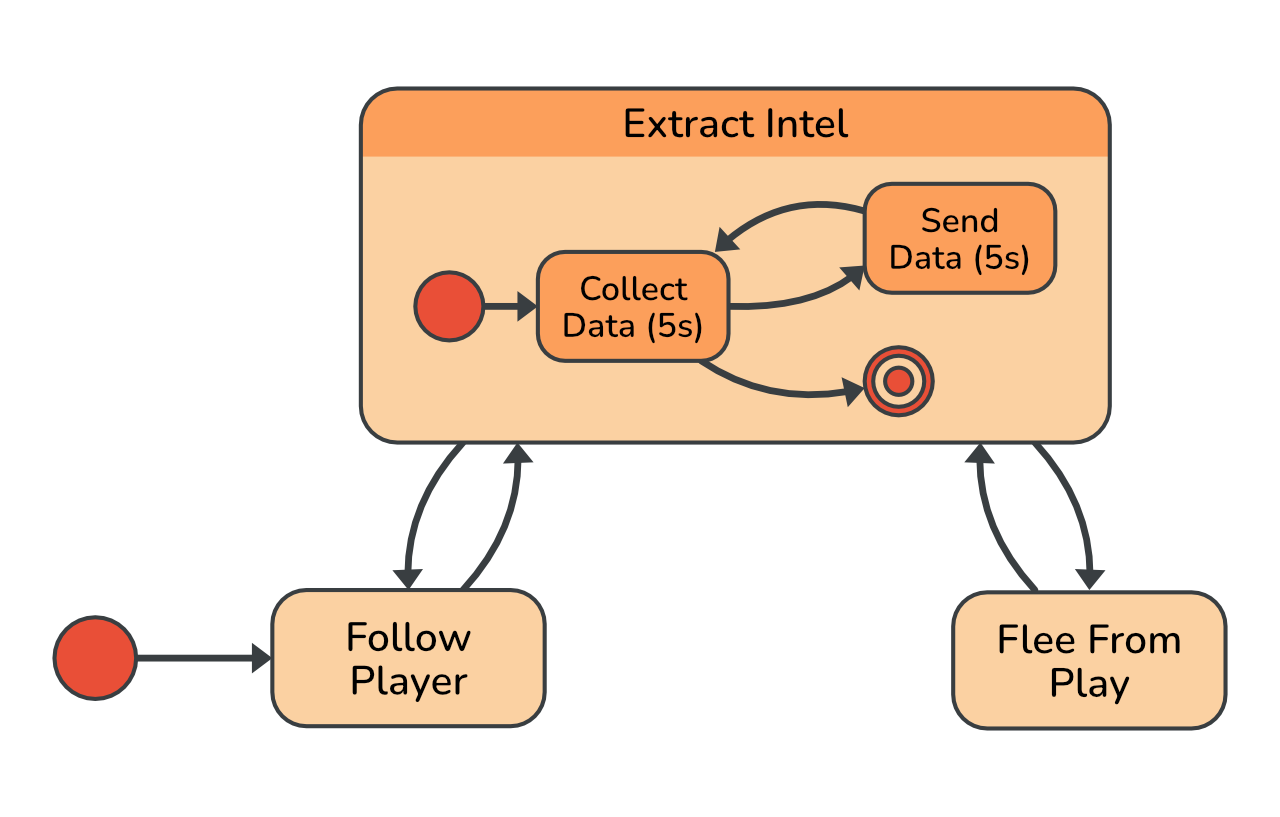 fsm.AddState("ExtractIntel", new StateBase<string>(needsExitTime: false));Furthermore, we can actually shorten the other state definitions even more by using shortcut methods. We can for example write the FollowPlayer state in a more concise way: