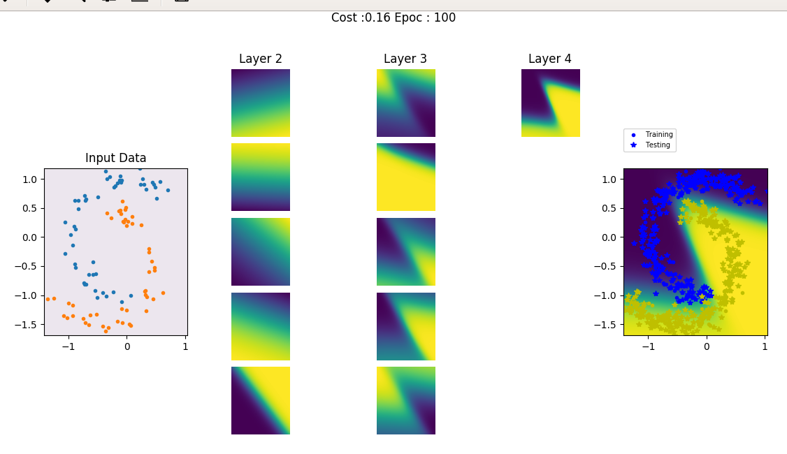 Testing data can also to given to network, Network won't use it for training, it will be only used for computing cost at every iteration for ploting Learning Curve and will also be shown on decesion boundries. By default Xts and yts are set to None