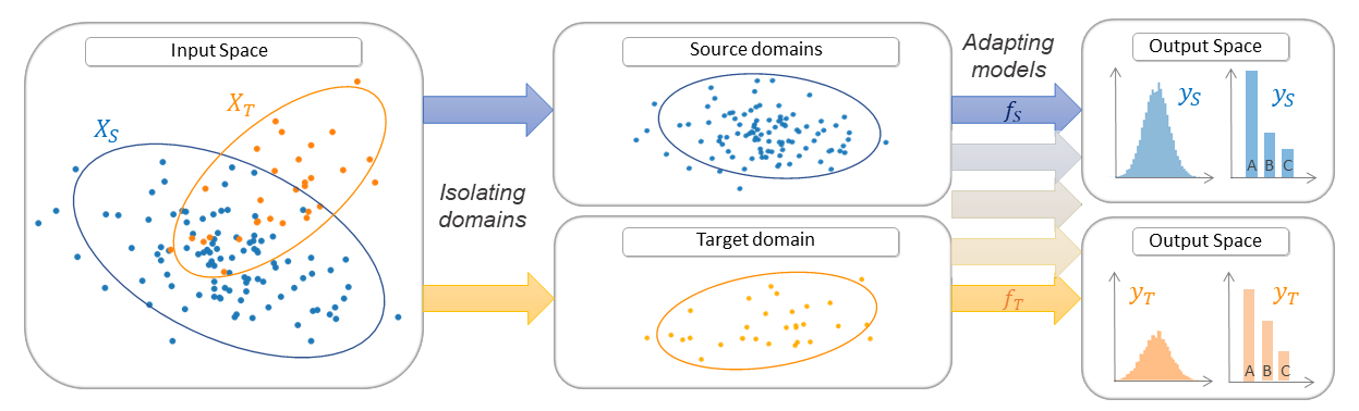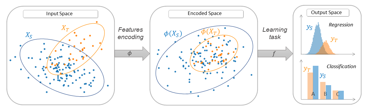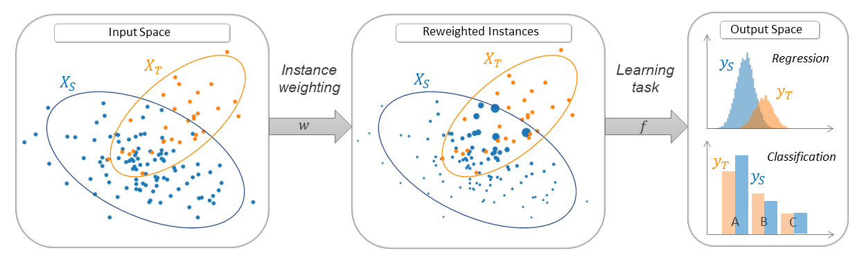 Thus, the transfer learning models from the ADAPT library can be seen as machine learning models that are fitted with a specific target in mind. This target is different but somewhat related to the training data. This is generally achieved by a transformation of the input features (see feature-based transfer) or by importance weighting (see instance-based transfer). In some cases, the training data are no more available but one aims at fine-tuning a pre-trained source model on a new target dataset (see parameter-based transfer).