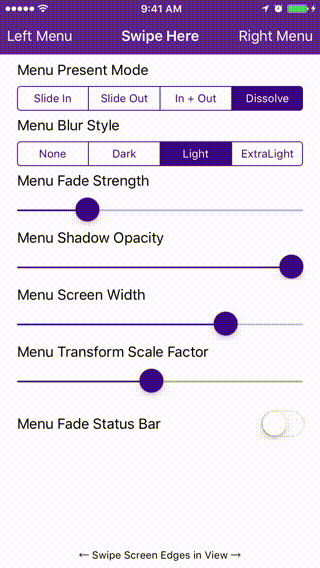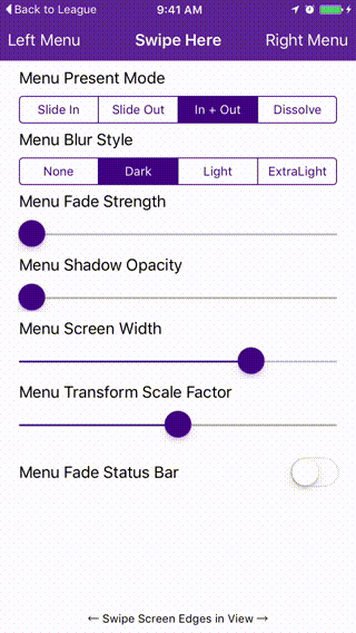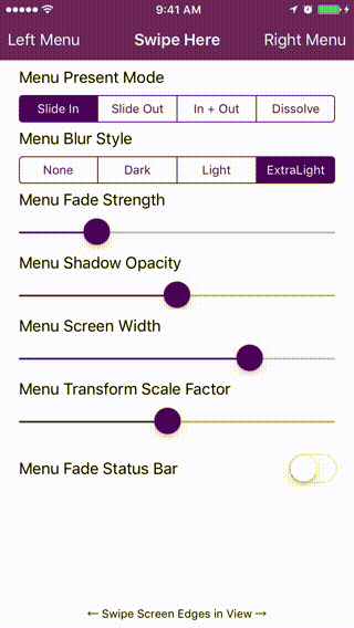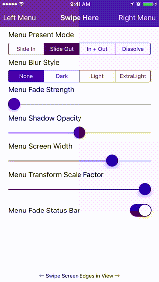 - Supports continuous swiping between side menus on boths sides in a single gesture.