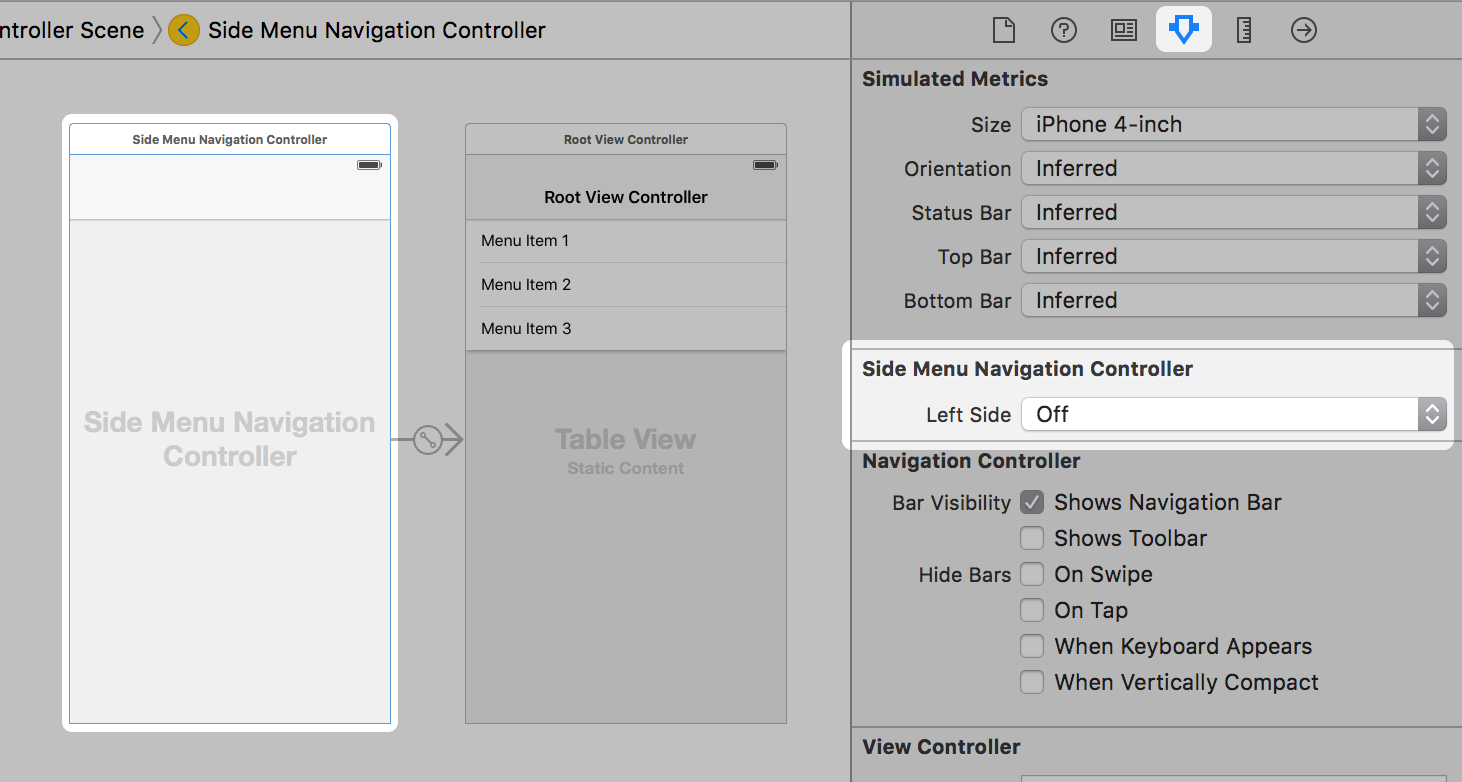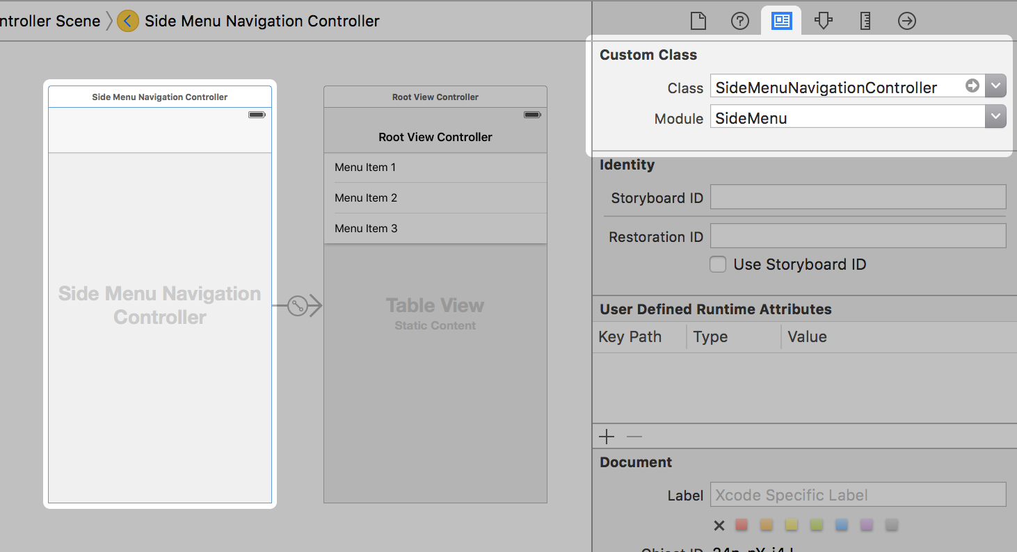 Custom Classof the Navigation Controller to beSideMenuNavigationControllerin the Identity Inspector. Set theModuletoSideMenu(ignore this step if you've manually added SideMenu to your project). Create a Root View Controller for the Navigation Controller (shown as a UITableViewController below). Set up any Triggered Segues you want in that view controller.