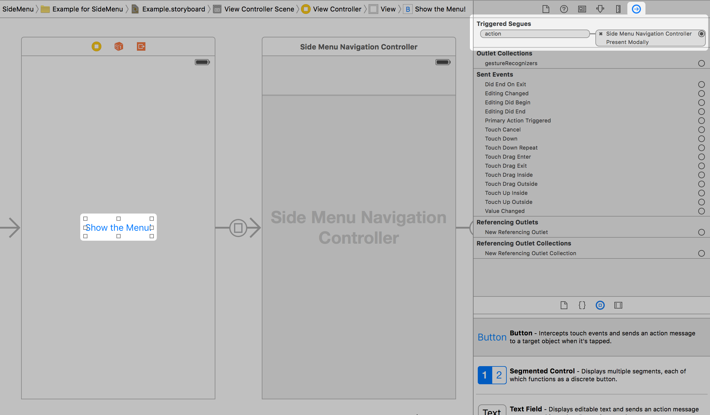 Left Sideproperty of theSideMenuNavigationControllerto On if you want it to appear from the left side of the screen, or Off/Default if you want it to appear from the right side.