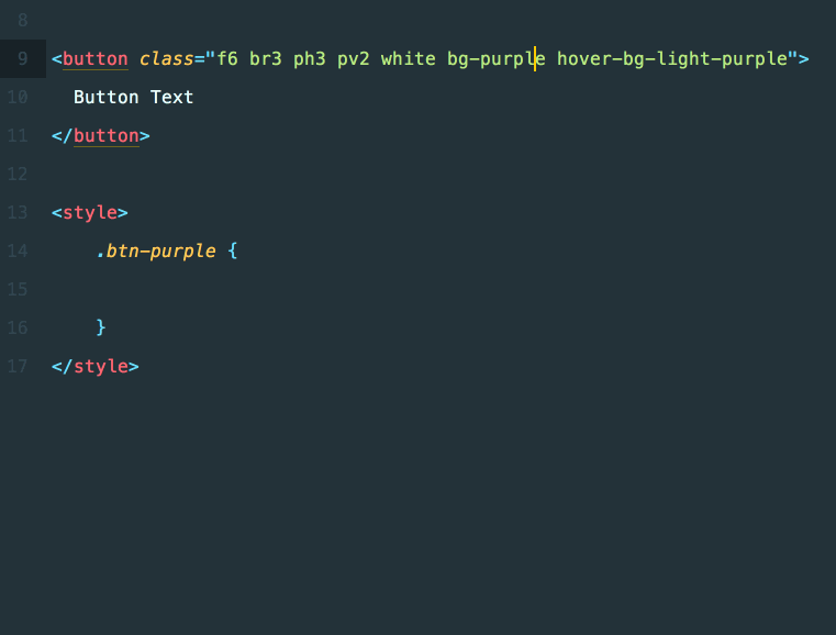 f6: Use the sixth font size in the font size scale (.875rem in Tachyons)br3: Use the third border radius in the radius scale (.5rem)ph3: Use the third size in the padding scale for horizontal padding (1rem)pv2: Use the second size in the padding scale for vertical padding (.5rem)white: Use white textbg-purple: Use a purple backgroundhover-bg-light-purple: Use a light purple background on hover