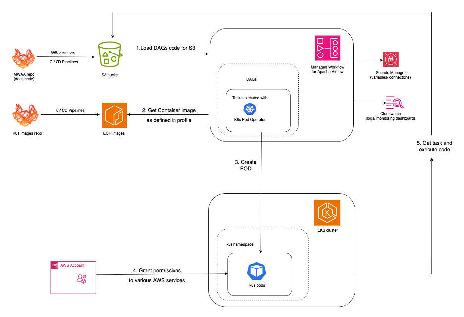- Performance Optimization: A significant portion of the DAGs are dynamically generated based on database metadata. This generation process runs outside Amazon MWAA, with its own CI/CD pipeline, and the resulting DAG files are stored in the S3 DAG. Placing code outside of tasks was avoided, including parameter evaluation. Parameters and secrets are stored in AWS Secrets Manager and retrieved at task runtime. Engineers aim to minimize or eliminate inter-service dependencies within MWAA.
