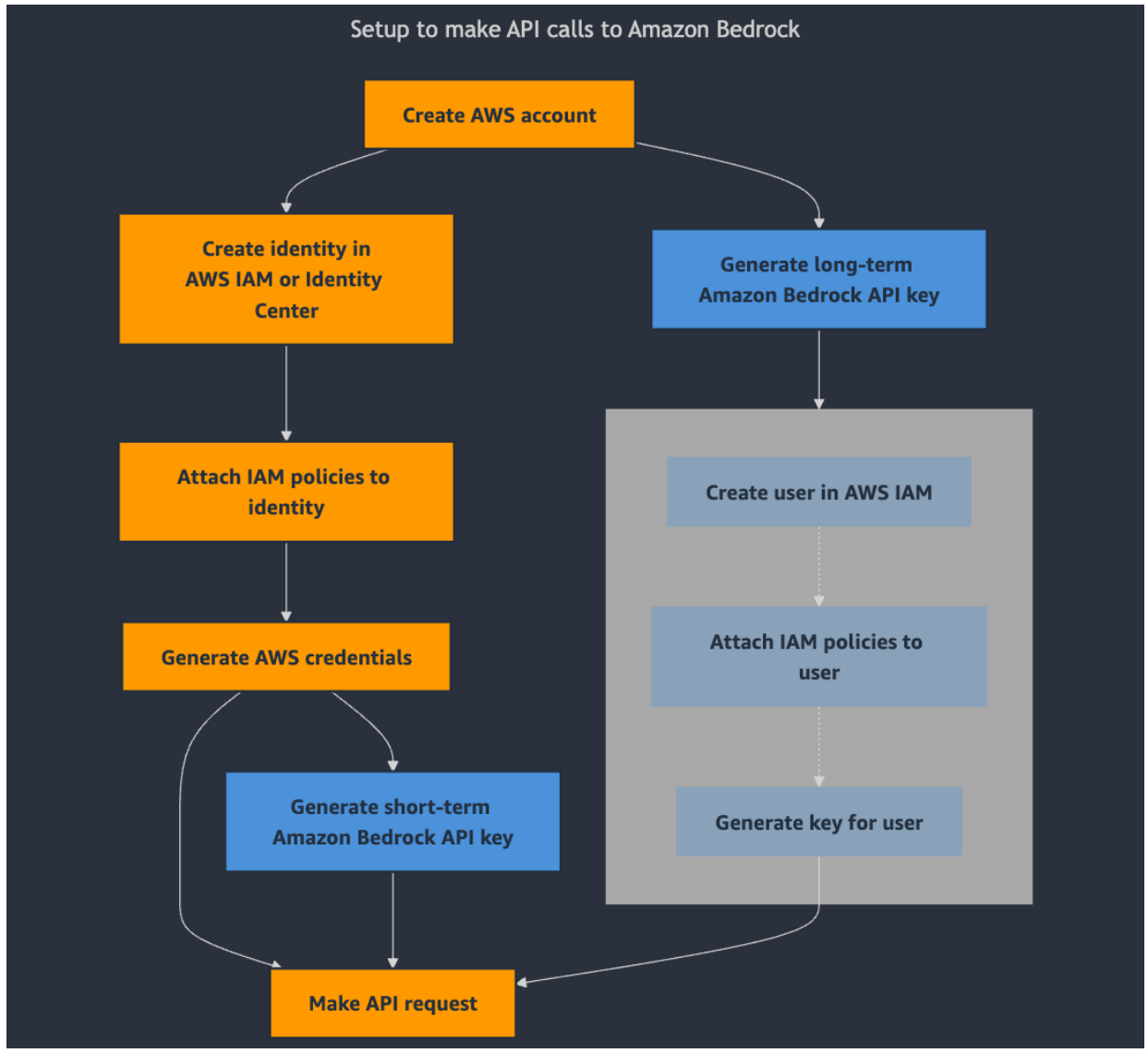 The diagram compares the default authentication process to Amazon Bedrock (in orange) with the API keys approach (in blue). In the default process, you must create an identity in AWS IAM Identity Center or AWS IAM, attach IAM policies to provide permissions to perform API operations, and generate credentials, which you can then use to make API calls. The grey boxes in the diagram highlight the steps that Amazon Bedrock now streamlines when generating an API key. Developers can now authenticate and access Amazon Bedrock APIs with minimal setup overhead.
