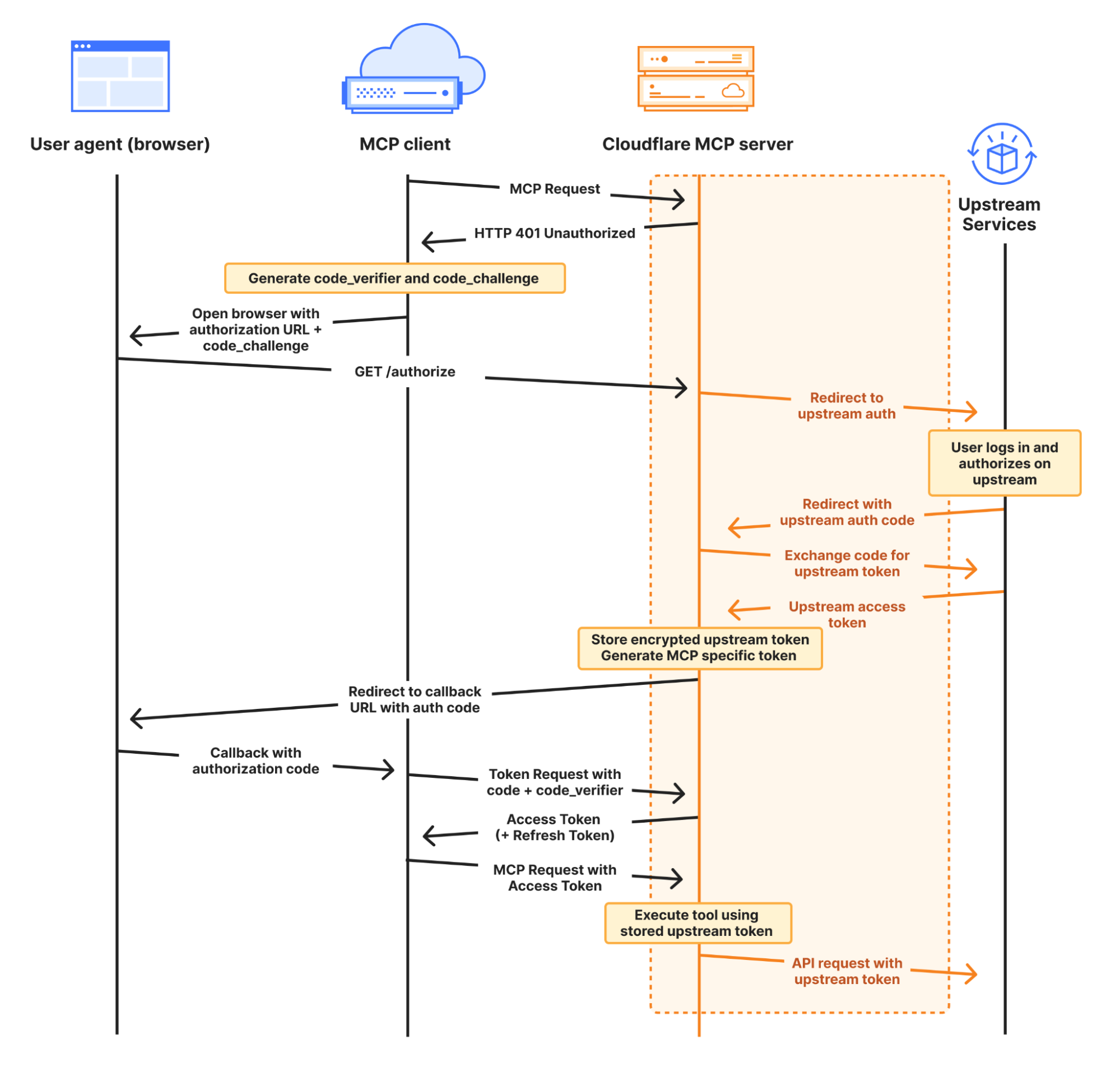 MCP does this with OAuth, which has been the standard protocol that allows users to grant applications to access their information or services, without sharing passwords. Here, the MCP Server itself acts as the OAuth Provider. However, OAuth with MCP is hard to implement yourself, so when you build MCP servers on Cloudflare we provide it for you.