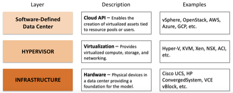 Resource pooling, usage tracking, and governance on top of the Hypervisor layer give rise to the Software-Defined Data Center (SDDC). The notion of “infrastructure as code” becomes possible at this layer through the use of REST APIs. Users at this layer are typically agnostic to Infrastructure and Hypervisor specifics below them and have grow accustomed to thinking of compute, network, and storage resources as simply being available whenever they want.