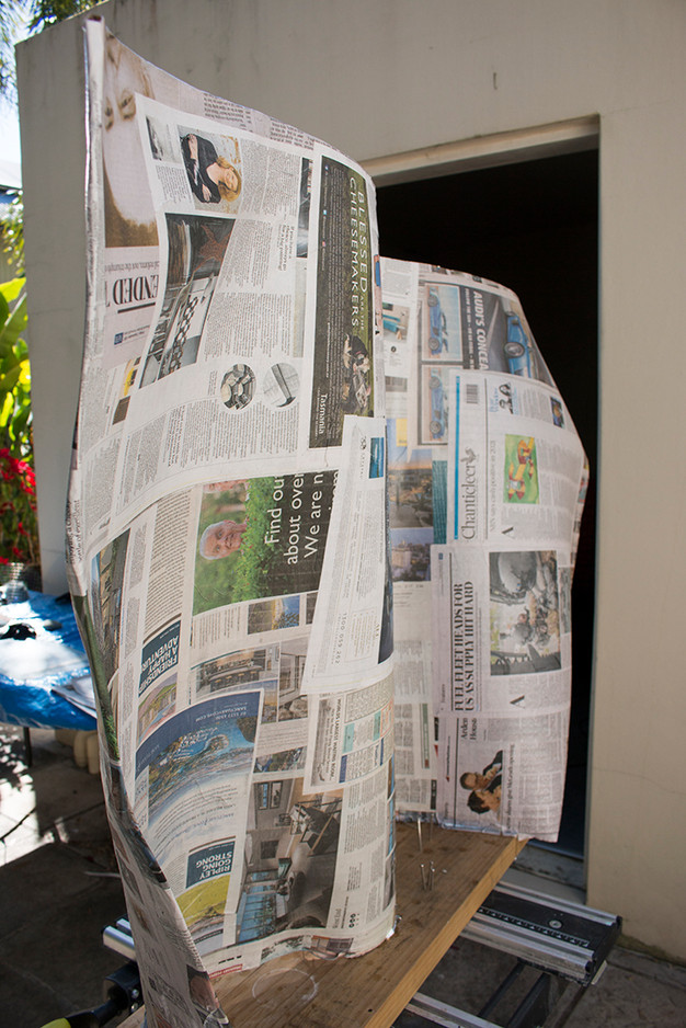 Newspaper and thinned PVA glue is used to build up the thickness of the form providing rigidity and a smoothed surface (given I'm being very careful in the application). PVA is thinned with acetone and was chosen as the binder which would dry very quickly. Traditional glue paste made from flour and water would take a long time to dry and has a tendency to mould. This method also exploits PVA's plasticity and flexibility.