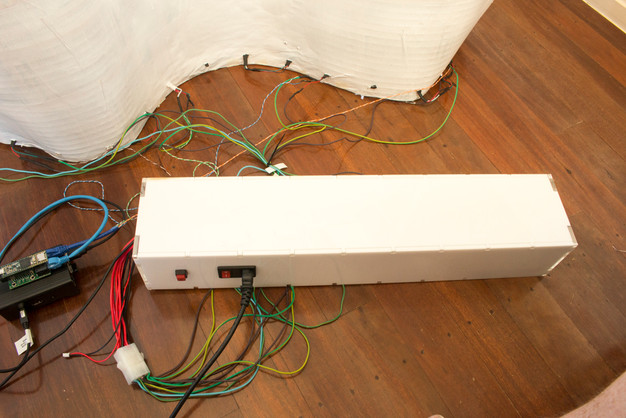 To create a housing for the electronics a design was lasercut from white acrylic sheet - with provisions for ventilation, switches and cables.