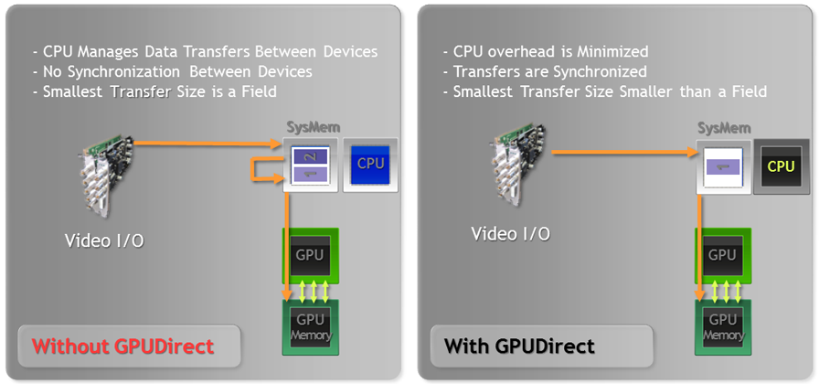 NVIDIA® GPUDirect® for Video technology helps IO board manufacturers write device drivers that efficiently transfer video frames in and out of NVIDIA GPU memory.