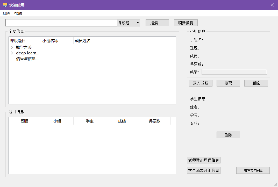- 信息检索操作提供三类信息检索:课设题目检索,专业检索和学生姓名检索。
