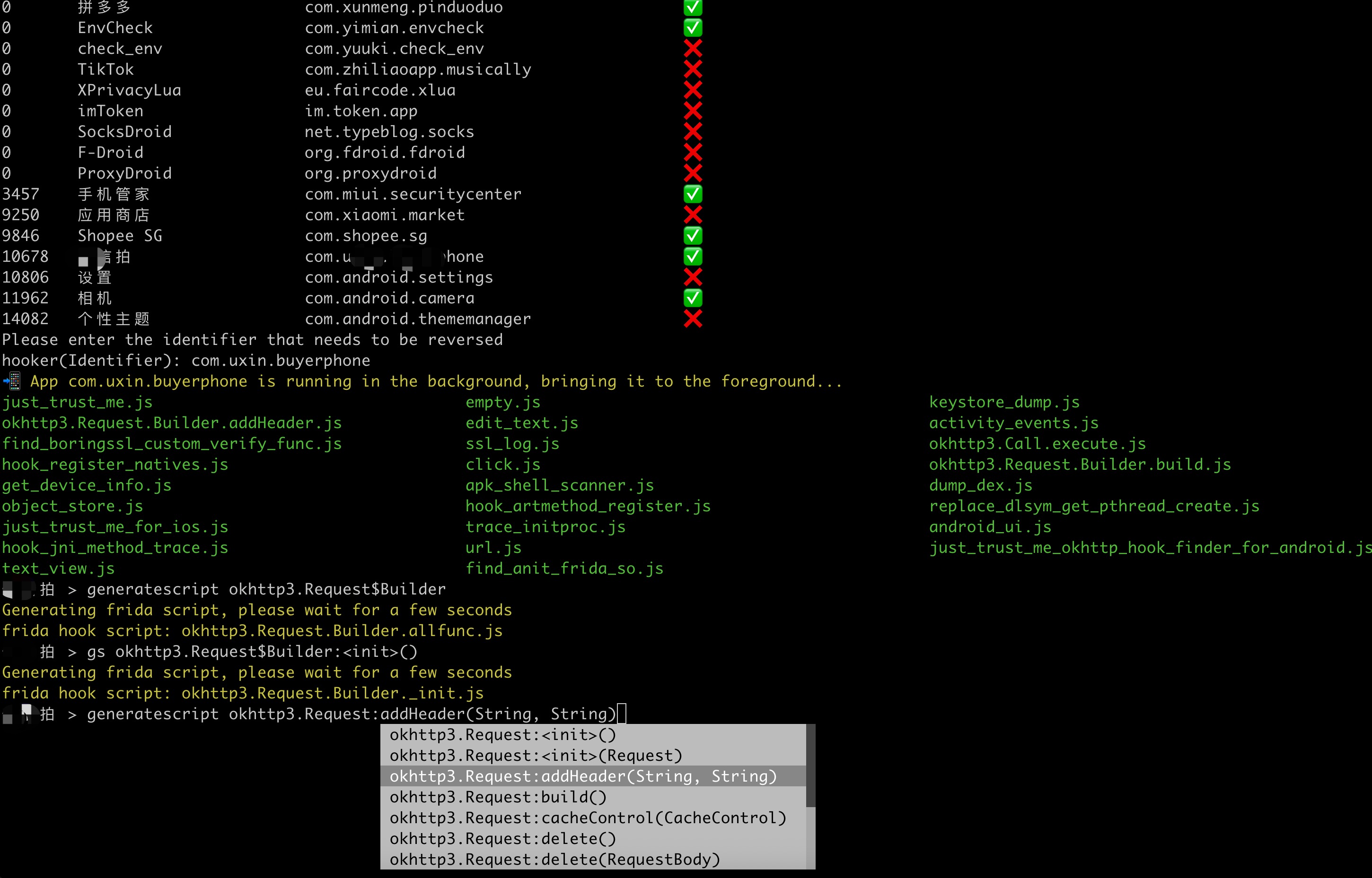 hooker是一个基于frida实现的逆向工具包。旨在为安卓逆向开发人员提供一个舒适的命令行界面和一些常用的通杀脚本、自动化生成hook脚本、内存漫游探测activity和service、frida版JustTrustMe、boringssl unpinning全网app通杀