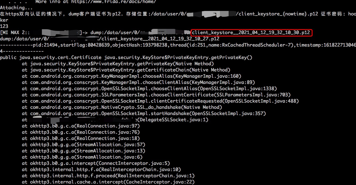 在https双向认证的情况下,dump客户端证书为p12。存储位置:/data/user/0/{packagename}/client_keystore_{nowtime}.p12 证书密码: hooker。原理是hook java.security.KeyStore的getPrivateKey和getCertificate方法,因为客户端向服务发送证书必调这个方法。强烈建议keystore_dump.js用spawn模式启动,