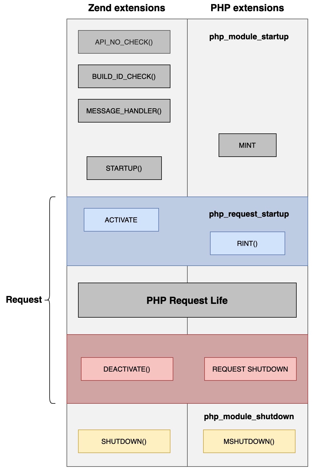 MINT:模块初始化时被调用MSHUTDOWN:模块结束化时被调用RINT:每一次请求时被调用RSHUTDOWN:每一次请求结束后被调用