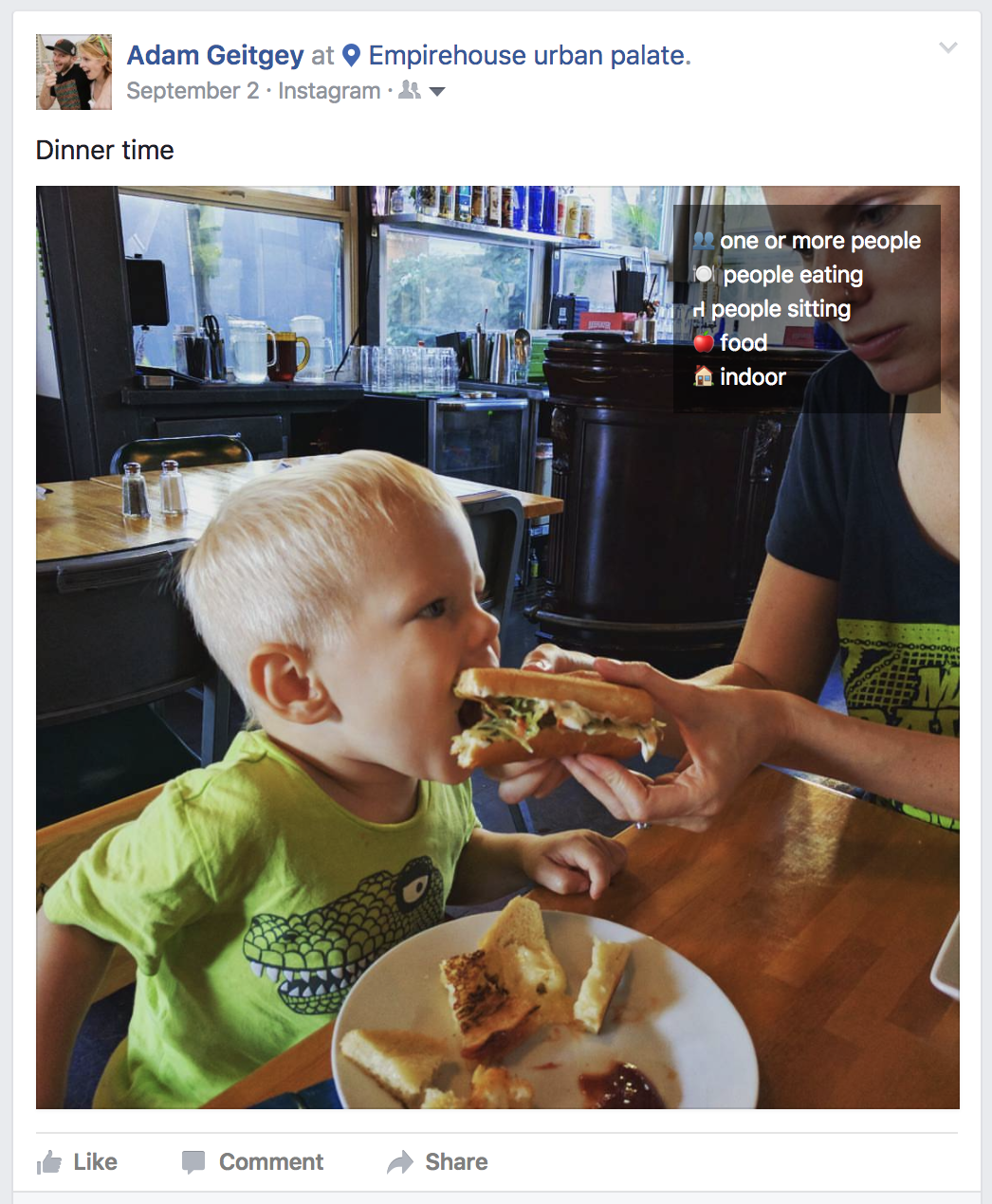 Here's some examples of the kinds of things that Facebook detects in your photos: