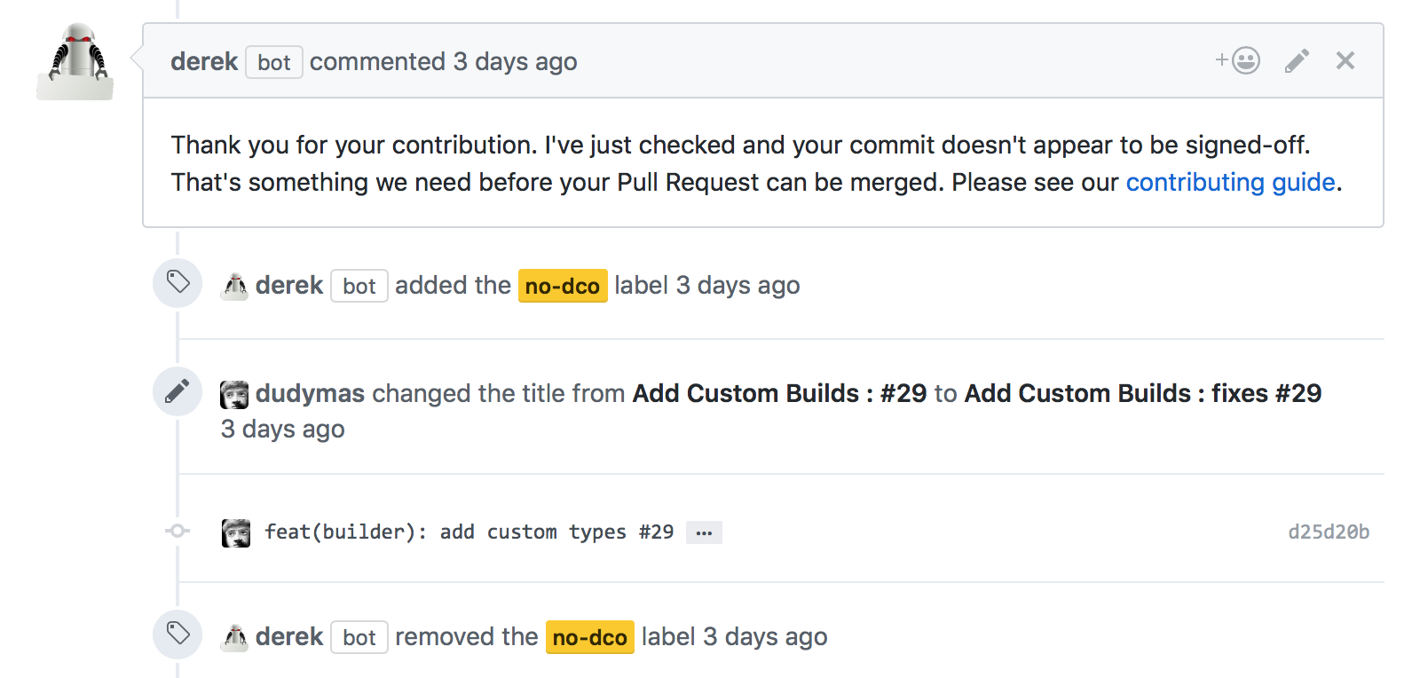 This is me in action with the DCO-checking feature. If I find a commit that isn't signed off then I'll let the contributor know in a comment. Normally they edit their commits and re-push within a few minutes after re-reading the message.
