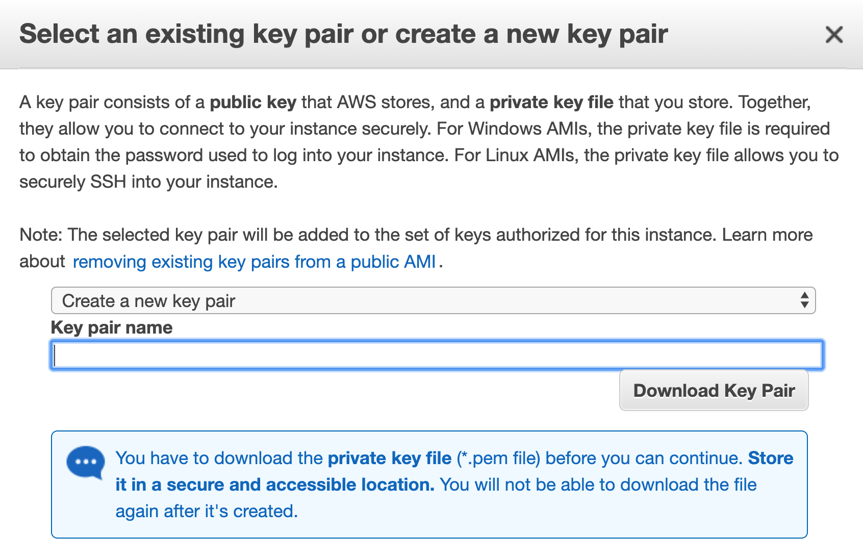 - You will see a window about SSH keys - select new keypair, give the key a name (any name is fine) and click the accept box. The SSH pem key file will download to your machine.