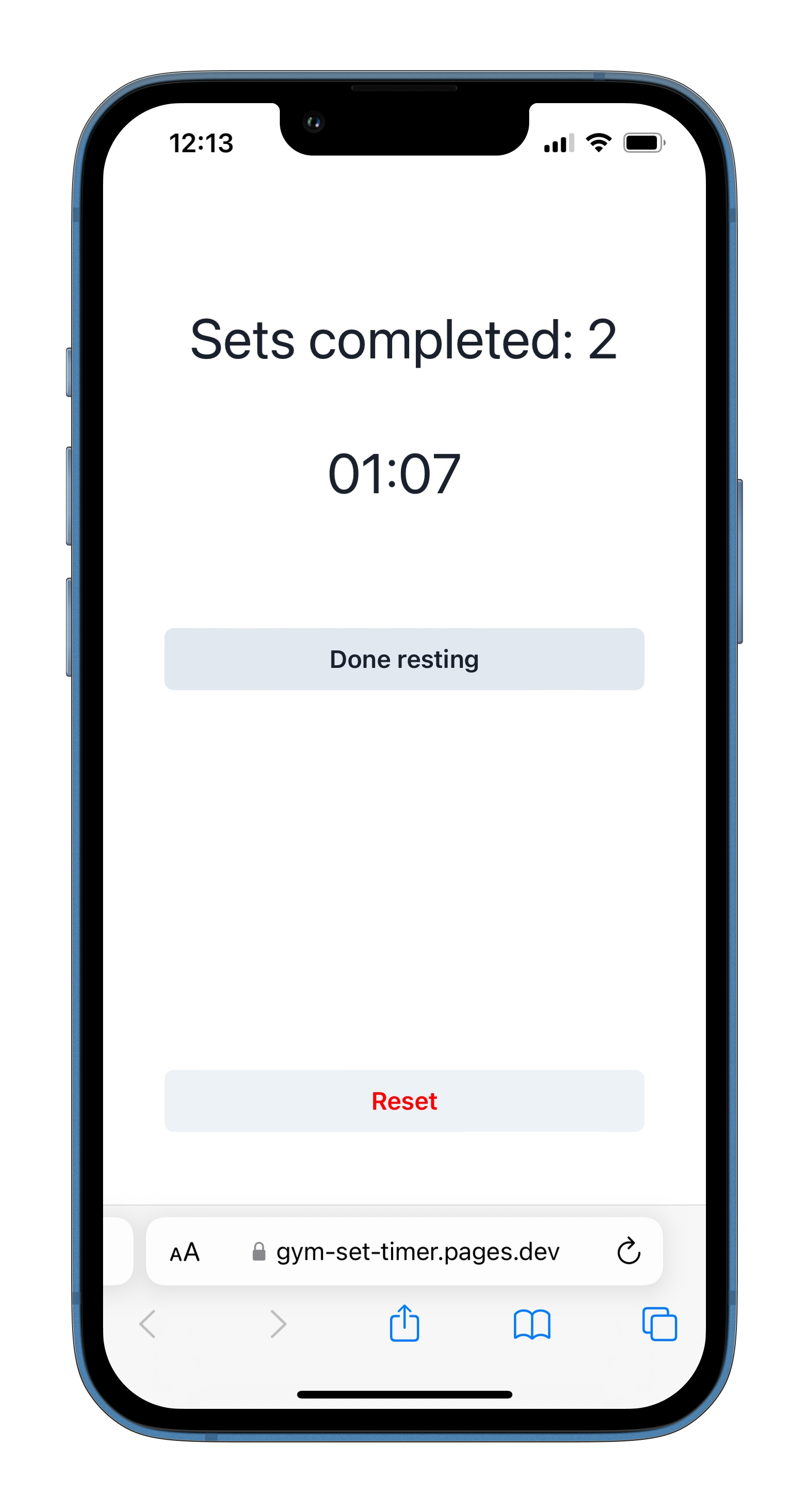I recommend installing it as a Progressive Web App (On iOS: Share menu -> Add to Home Screen), so it's a standalone app that's easy to navigate into and not a tab in Safari. The set count and timer is retained in local storage, so it will continue where you left off even if you force close the app.