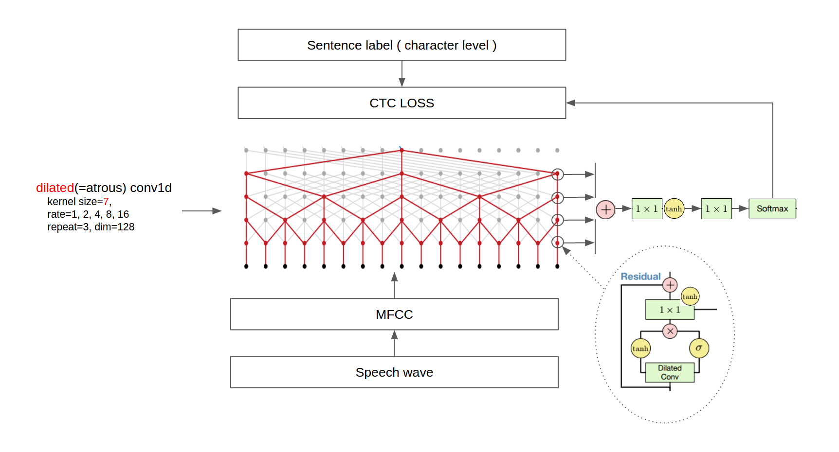 A tensorflow implementation of speech recognition based on DeepMind's WaveNet: A Generative Model for Raw Audio. (Hereafter the Paper)