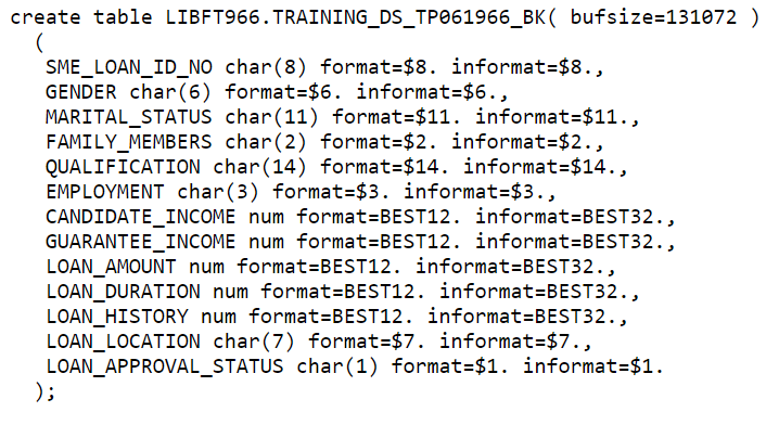 | LOAN_HISTORY | Records of previous loans | TRAINING_DS, TESTING_DS | Categorical | Numeric | 8 | 0; 1 |
