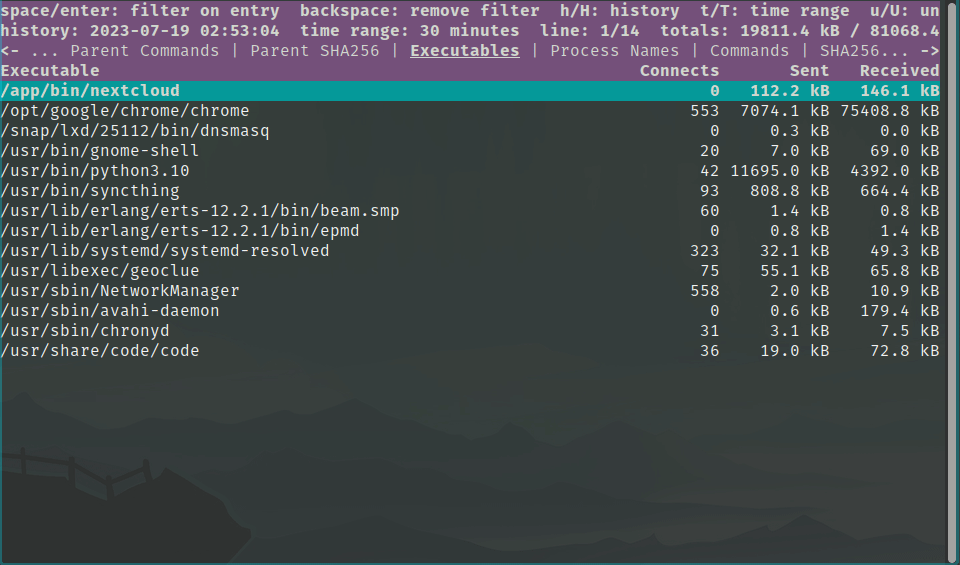 picosnitch view space/enter/f: filter on entrye: exclude entrybackspace/F/E: remove filterh/H: step through history (time offset)t/T: cycle time rangeu/U: cycle byte unitsr: refresh viewq: quit