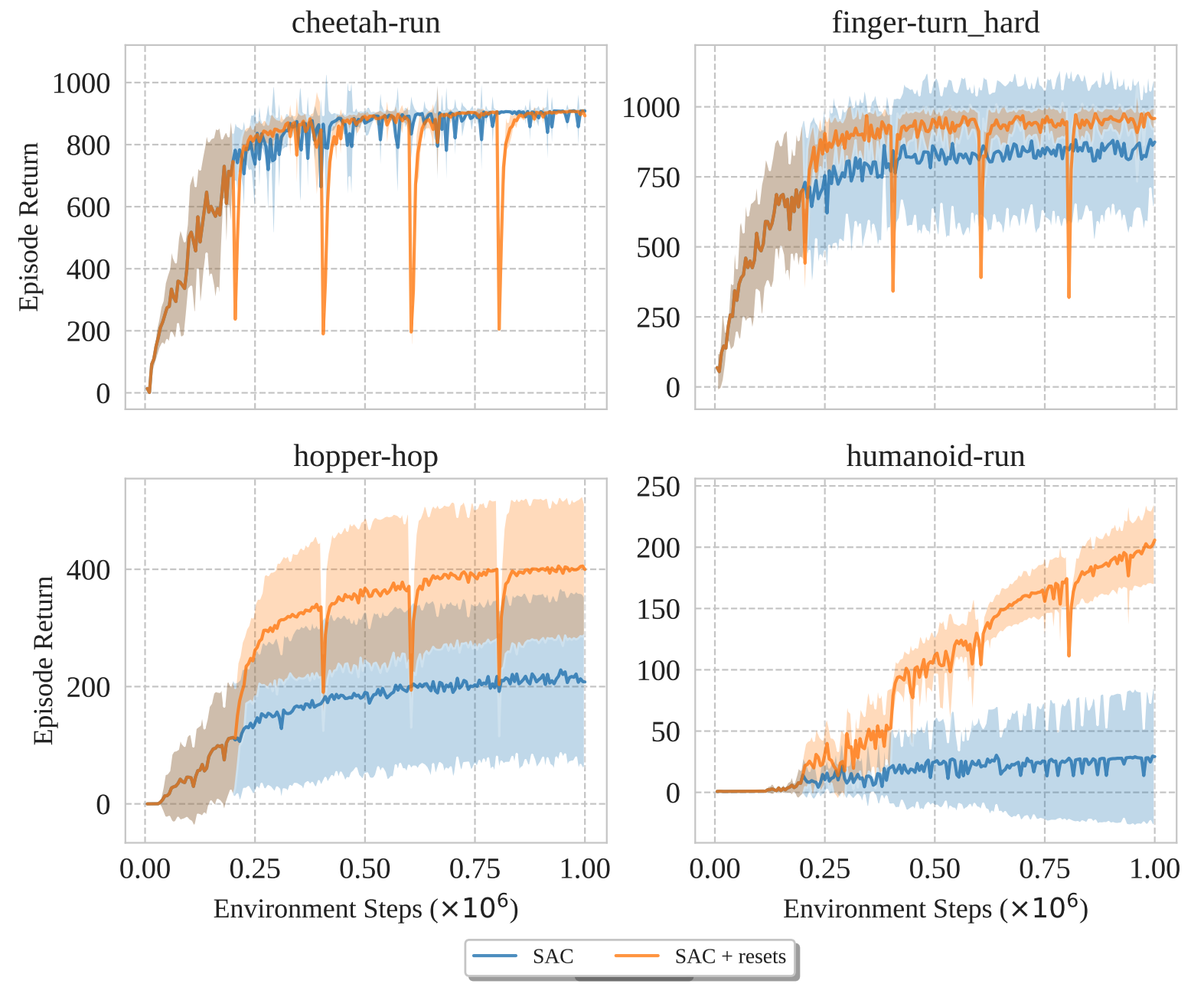 | SAC + resets | 656 (549, 753) | 617 (538, 681) | 607 (547, 667) |