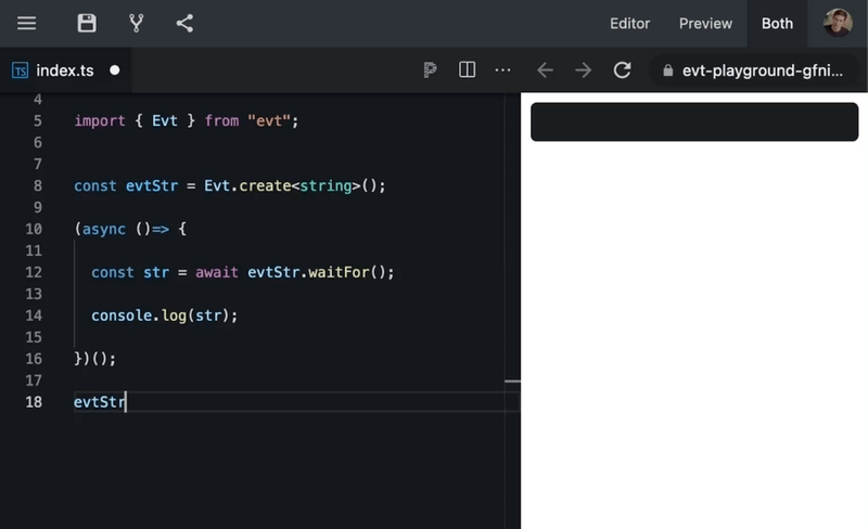 import { Evt } from "https://deno.land/x/evt/mod.ts";$ npm install --save evtimport { Evt } from "evt"; There are a lot of things that can't easily be done with EventEmitter: