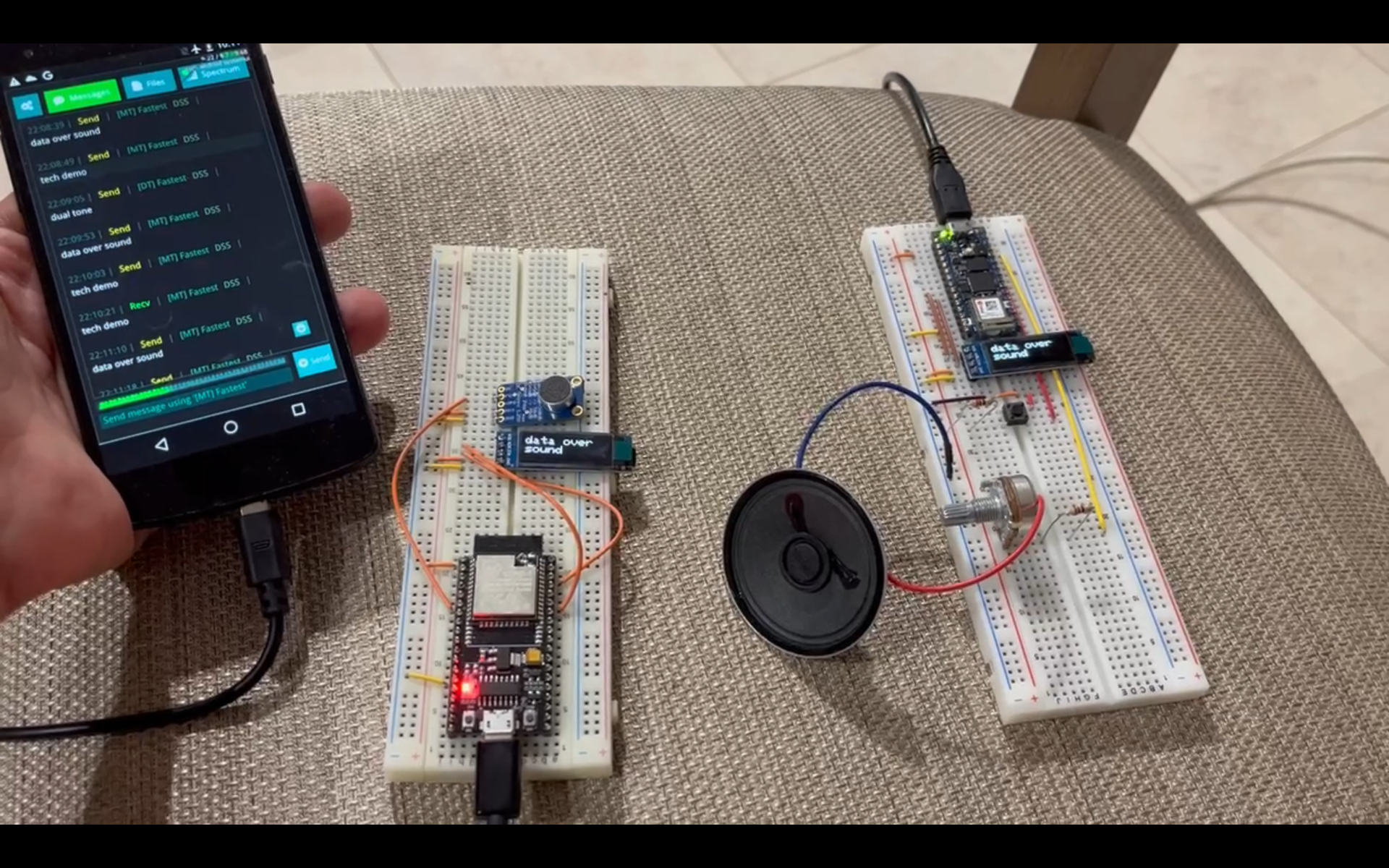 This library allows you to communicate small amounts of data between air-gapped devices using sound. It implements a simple FSK-based transmission protocol that can be easily integrated in various projects. The bandwidth rate is between 8-16 bytes/sec depending on the protocol parameters. Error correction codes (ECC) are used to improve demodulation robustness.
