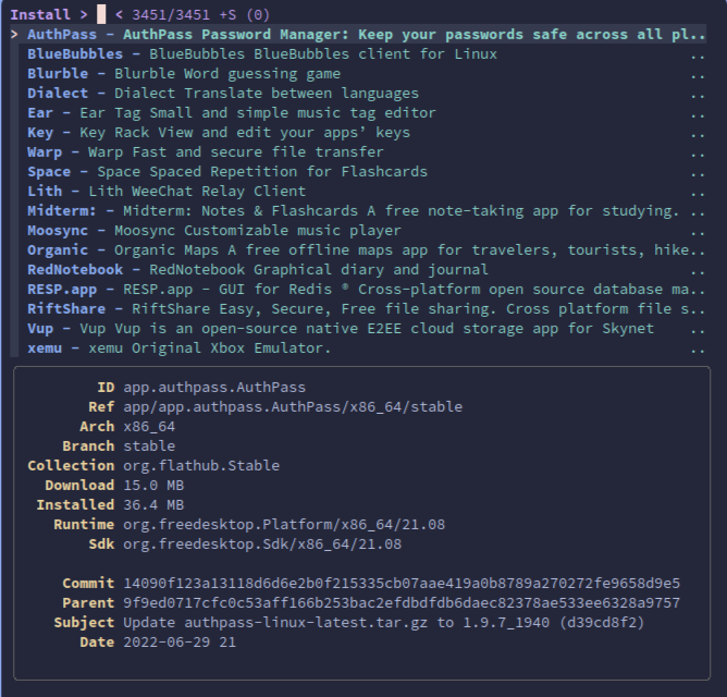 }Shows version & repository, elaborate preview, bindings to show package in web, caches AUR packages list: