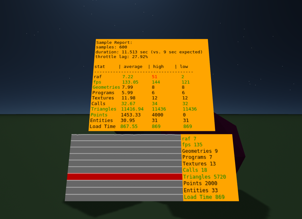 <a-scene extra-stats vr-super-stats='samplereport:{"autostart":true};'></a-scene><a-scene extra-stats vr-super-stats></a-scene>