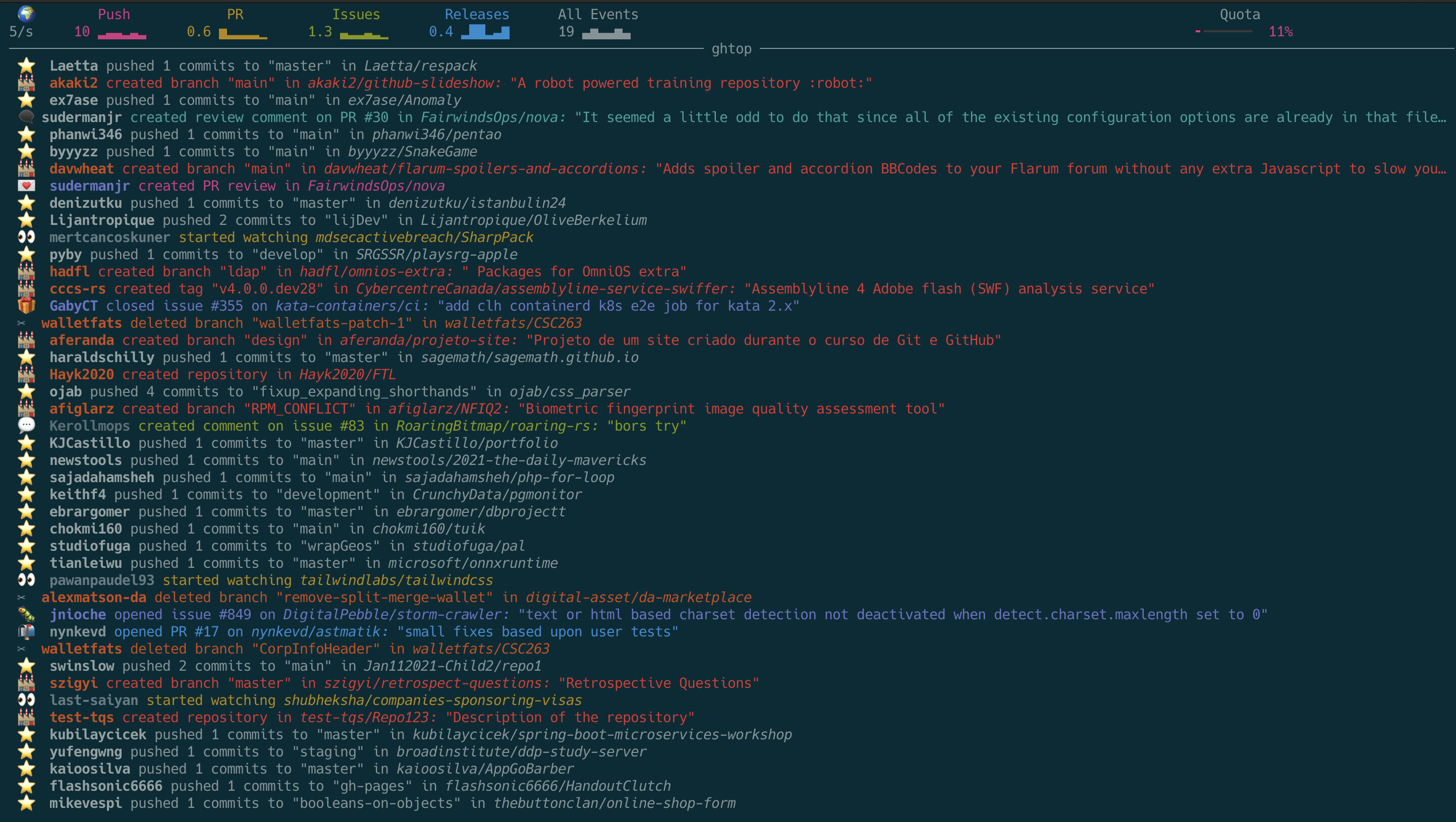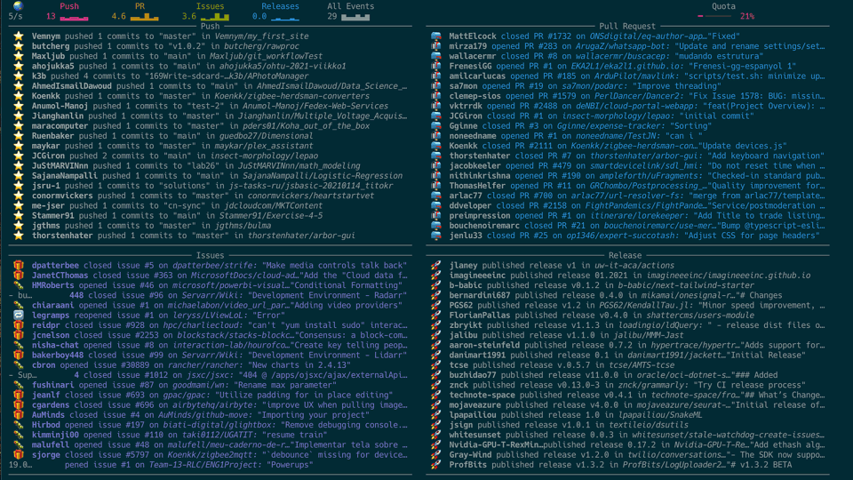 The same information as tail, but in a split window showing separately PRs, issues, pushes, and releases.