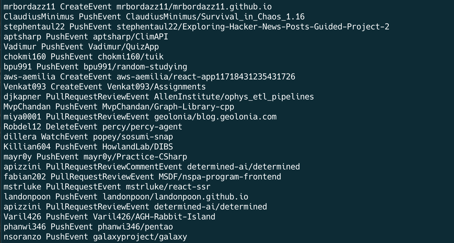 --include_bots: By default events that appear to be from bots are excluded. Add this flag to include them--types TYPES: Optional comma-separated list of event types to include (defaults to all types). For a full list of types, see the GitHub event types docs--pause PAUSE: Number of seconds to pause between requests to the GitHub api (default: 0.4). It is helpful to adjust this number if you want to get events more or less frequently. For example, if you are filtering all events by an org, then you likely want to pause for a longer period of time than the default.--filtand--filtval: Optionally filter events to just those from one of:user,repo, ororg, depending onfilt.filtvalis the value to filter by. See the GitHub docs for details on the public event API calls used.