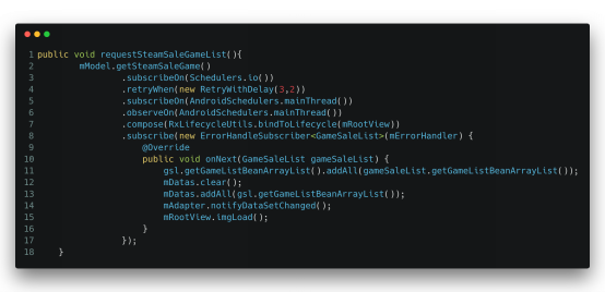 同时RxJava的编写风格是流式的,比原生的异步逻辑上更加清楚,而且RxJava支持线程的自由控制。例如下面的方法是请求Steam的打折列表(函数属于逻辑控制,处于P层),首先mModel(M层)请求服务器数据,subscribeOn(Schedules.io())表示getSteamSaleGame()这个方法执行在io线程上,subscribeOn(AndroidSchedulers.mainThread())表示retryWhen(new RetryWithDelay(3,2))(这个方法就是如果请求失败就继续重试3次,每次延时2秒)执行在主线程,而observeOn(AndroidSchedulers.mainThread())方法表示后面的都执行在主线程中。比如onNext()中的mRootView.imgLoad(),就是P层在M层获取data后调用V层显示data,这个就是MVP架构的运作模式。结合RxJava控制M层数据操作都在IO线程,V层都在主线程(安卓限制只能在主线程更新UI)。所以RxJava和MVP结合是起到1+1>2的作用的。