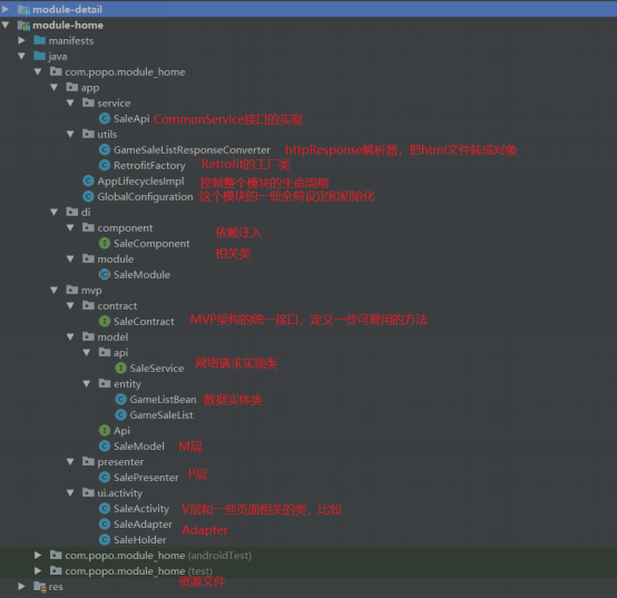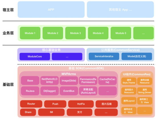 我们的App模块对应的就是宿主层,而Home,Search和Detail模块对应的是业务层,可以看出微型服务提供者,CommonRes,CommonSDK和CommonService对应基础层,是公共资源和底层基础的提供者;