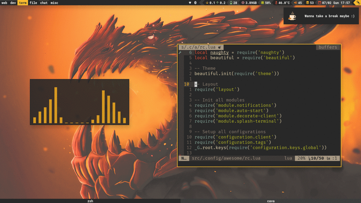 Welcome to ~/ Welcome, these are my personal configuration dotfiles for pretty much everything I use on my system. Setup Instructions Please head over to the old branch for setup instructions.
