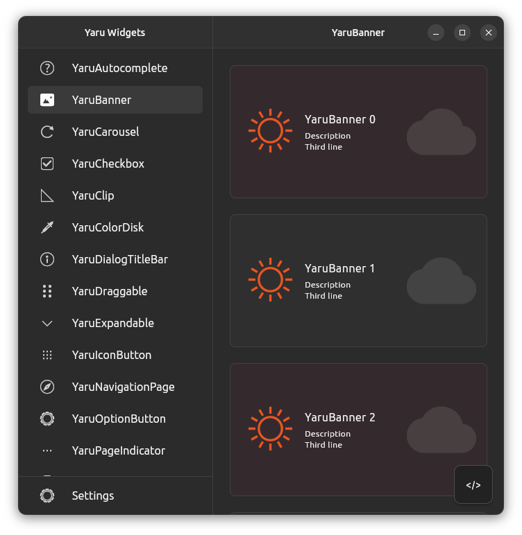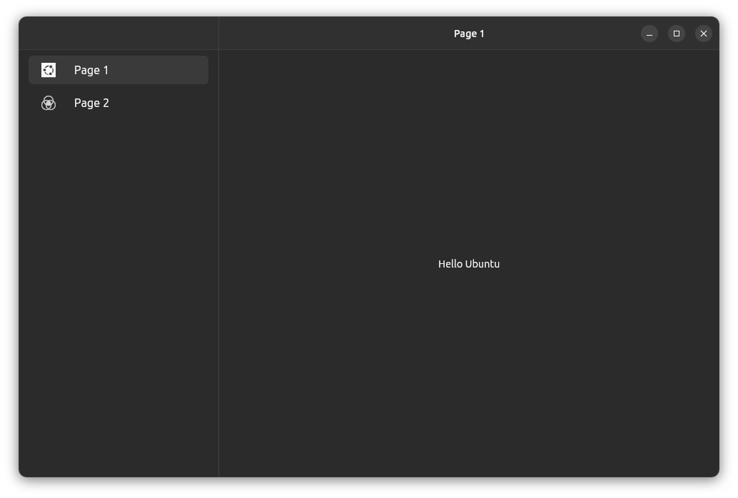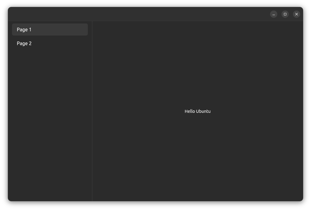 main.dartcode for this tutorial could be the following, depending on what pages and tiles you've chosen to show:import 'package:flutter/material.dart'; import 'package:yaru/yaru.dart'; Future<void> main() async { await YaruWindowTitleBar.ensureInitialized(); runApp(const MyApp()); } class MyApp extends StatelessWidget { const MyApp({super.key}); @override Widget build(BuildContext context) { return YaruTheme(builder: (context, yaru, child) { return MaterialApp( debugShowCheckedModeBanner: false, theme: yaru.theme, darkTheme: yaru.darkTheme, home: const _Home(), ); }); } } class _Home extends StatelessWidget { const _Home(); @override Widget build(BuildContext context) { return Scaffold( appBar: const YaruWindowTitleBar(), body: YaruMasterDetailPage( length: 2, tileBuilder: (context, index, selected, availableWidth) { if (index == 0) { return const YaruMasterTile( leading: Icon(YaruIcons.ubuntu_logo), title: Text('Page 1'), ); } else { return const YaruMasterTile( leading: Icon(YaruIcons.colors), title: Text('Page 2'), ); } }, pageBuilder: (context, index) { if (index == 0) { return const Center( child: Text('Hello Ubuntu'), ); } else { return const Center( child: Text('Hello Yaru'), ); } }, ), ); } }