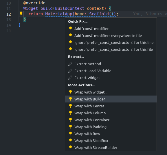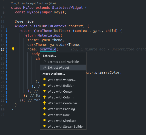 Scaffoldand re-open the quick-fix context menu as before with CTRL+. This time, selectExtract Widget -