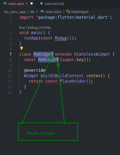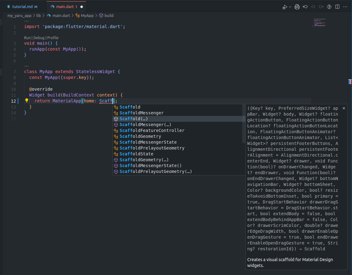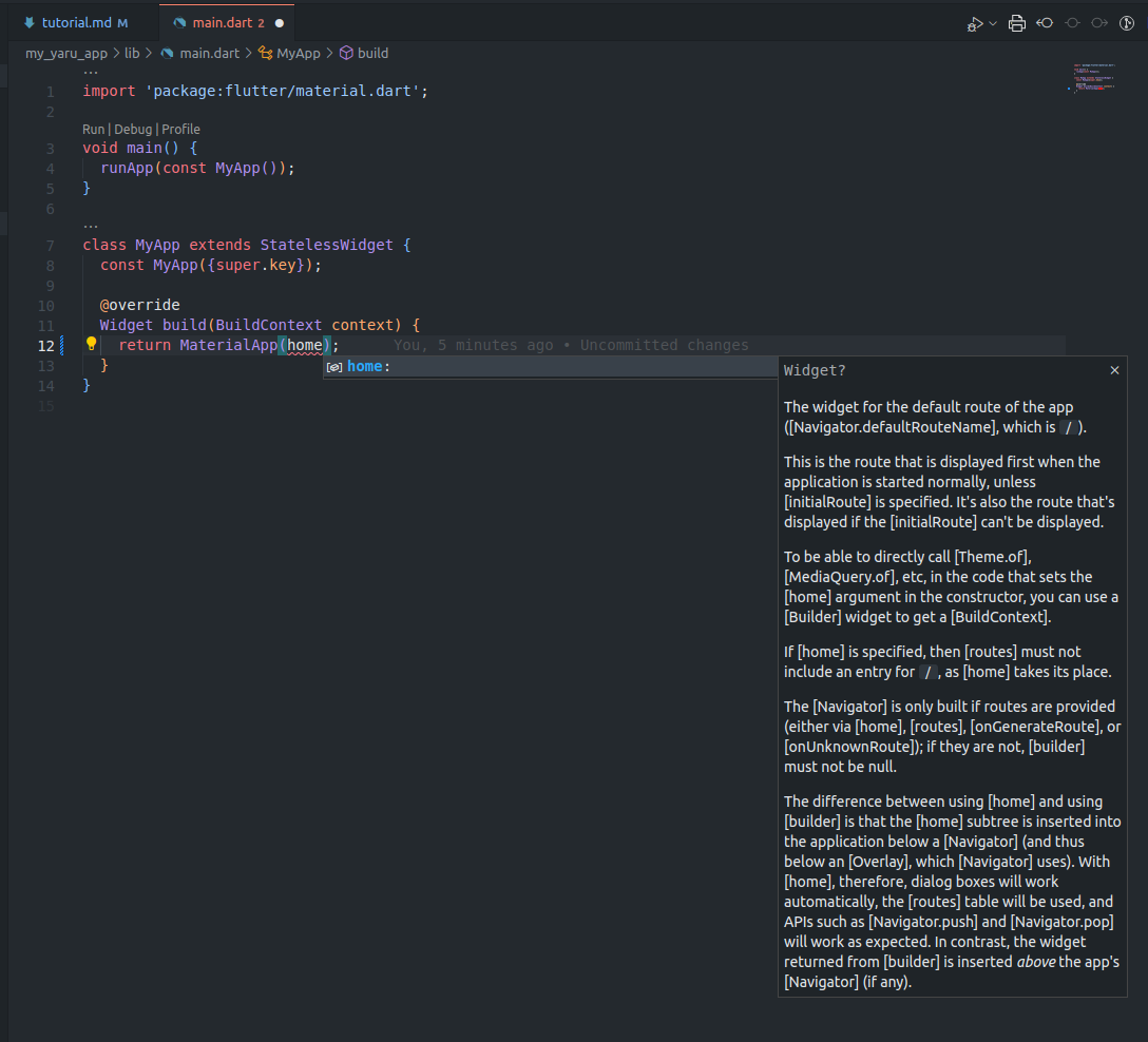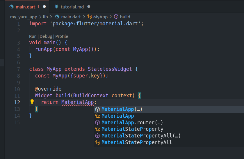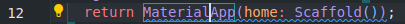 and write MaterialApp which opens a popup with a suggested class, press ENTER to replace PlaceHolder with MaterialApp()