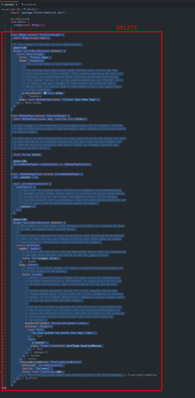 The Flutter template app is quite verbose explaining what it contains but we don't need most of the things in here for now.