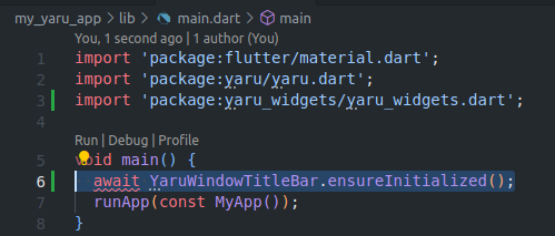 mainfunction should now look like this:Future<void> main() async { await YaruWindowTitleBar.ensureInitialized(); runApp(const MyApp()); }