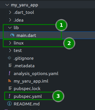 libdirectory where all of our dart code lives. For now a singlemain.dartfile should be enough. All platforms our app wants to be available for gets its own directory. In our case only theLinuxdirectory (2). We will come this back later. To define metadata of our app and the dependencies we want to use we need thepubspec.yamlfile (3).