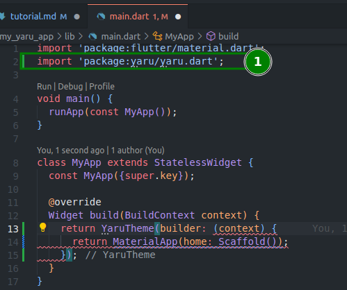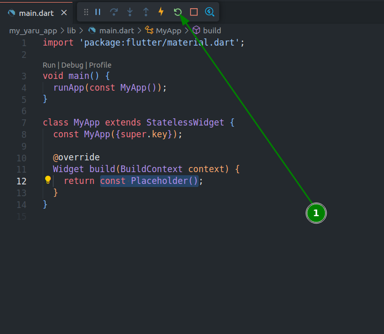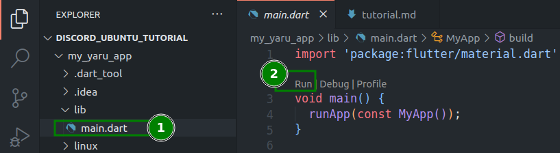 main.dart(1) to open the file in your editor and click on the smallRunlabel above thevoid main()declaration (2) to run the app for the first time