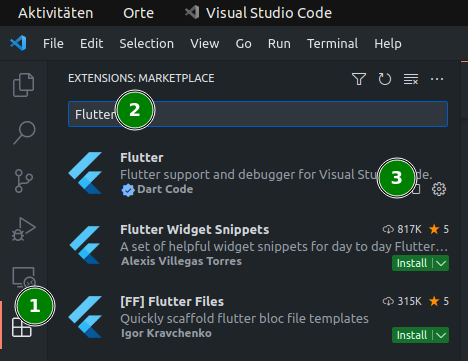 Open VsCode, click on the extension icon in the left sidebar (1), type "Flutter" and click "Install" on the first entry (3), this should be the Flutter extension by Dart Code.