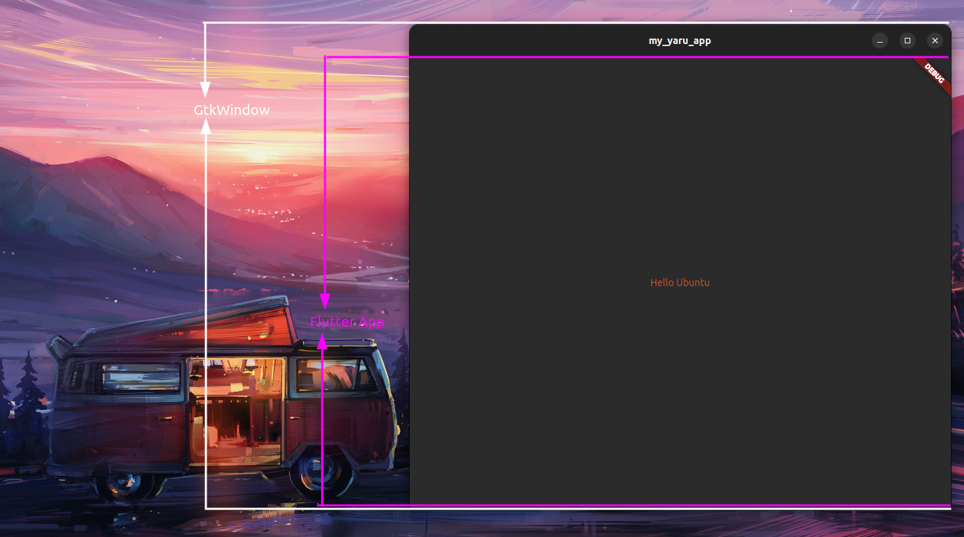 yaru.themeandyaru.darkThemelike so:import 'package:flutter/material.dart'; import 'package:yaru/yaru.dart'; Future<void> main() async { await YaruWindowTitleBar.ensureInitialized(); runApp(const MyApp()); } class MyApp extends StatelessWidget { const MyApp({super.key}); @override Widget build(BuildContext context) { return YaruTheme(builder: (context, yaru, child) { return MaterialApp( debugShowCheckedModeBanner: false, // <------------- theme: yaru.theme, // <----------- darkTheme: yaru.darkTheme, // <------------- home: Scaffold( appBar: const YaruWindowTitleBar(), // <------------- ), ); }); } }