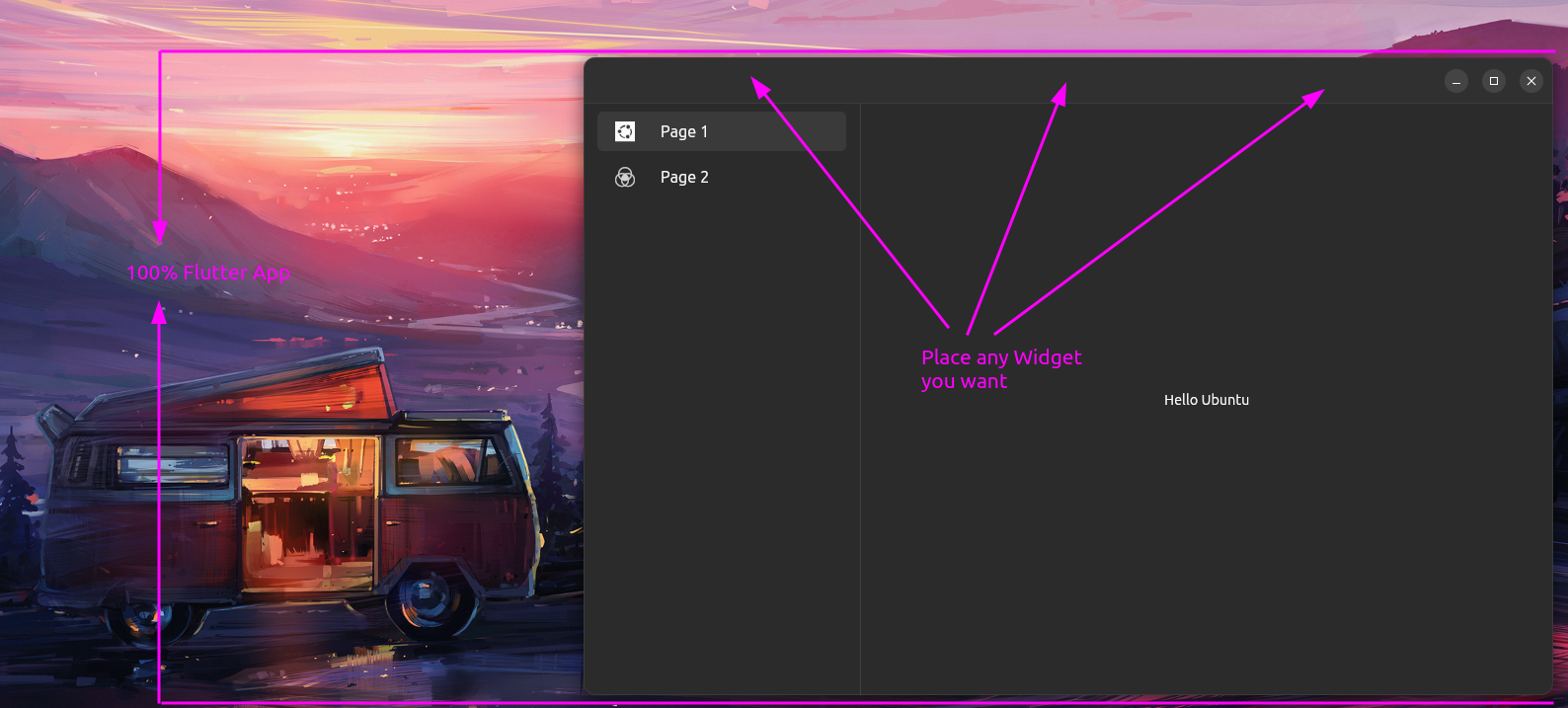 _Homecould now look like this, as a starting point:class _Home extends StatelessWidget { const _Home({super.key}); @override Widget build(BuildContext context) { return Scaffold( appBar: YaruWindowTitleBar(), body: YaruMasterDetailPage( length: 2, tileBuilder: (context, index, selected, availableWidth) { if (index == 0) { return YaruMasterTile(title: Text('Page 1')); } else { return YaruMasterTile(title: Text('Page 2')); } }, pageBuilder: (context, index) { if (index == 0) { return Center( child: Text('Hello Ubuntu'), ); } else { return Center( child: Text('Hello Yaru'), ); } }, ), ); } }