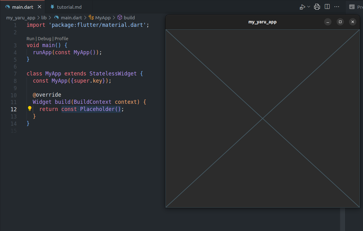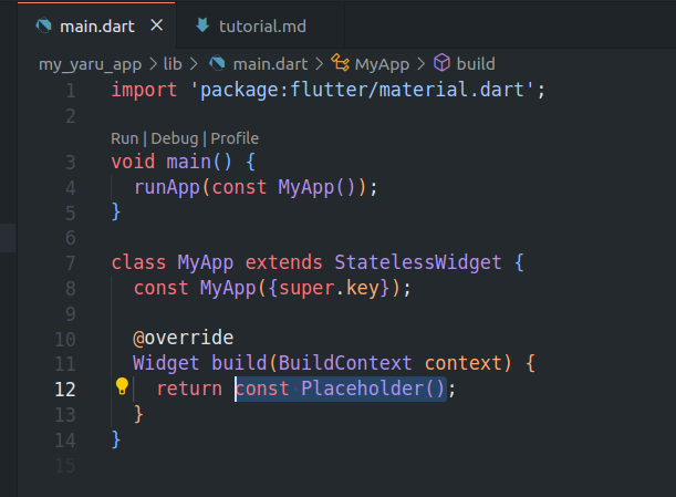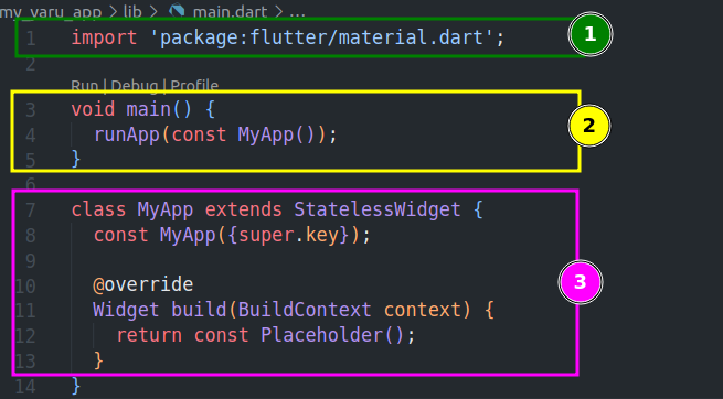 MyAppwhich extends the classStatelessWidget. Extending this class forces your app to implement theWidget build(BuildContext context)method, which you do by returning the WidgetPlaceHolder.