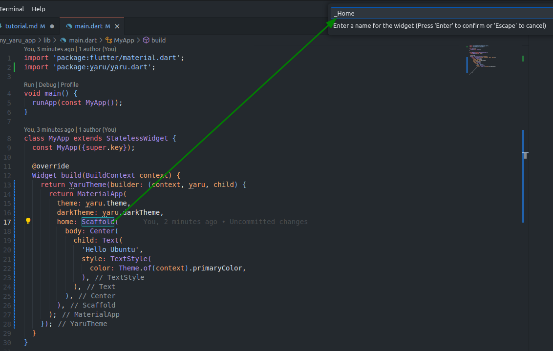 Now a popup should ... pop-up. (if not press CTRL+ENTER, if this does not help either, there is something wrong with your setup of vscode, flutter and the Flutter VsCode extension).