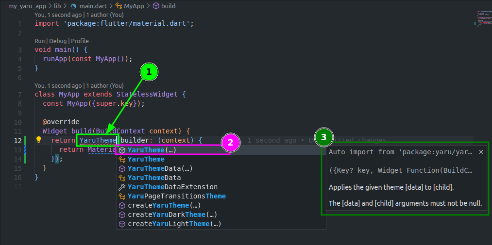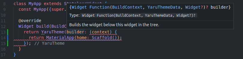 import 'package:flutter/material.dart'; import 'package:yaru/yaru.dart'; void main() { runApp(const MyApp()); } class MyApp extends StatelessWidget { const MyApp({super.key}); @override Widget build(BuildContext context) { return YaruTheme(builder: (context, yaru, child) { return MaterialApp(home: Scaffold()); }); } }