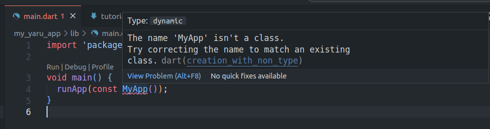 Dart will now complain that the class MyApp does not exist any longer. Because we've just deleted it on purpose.